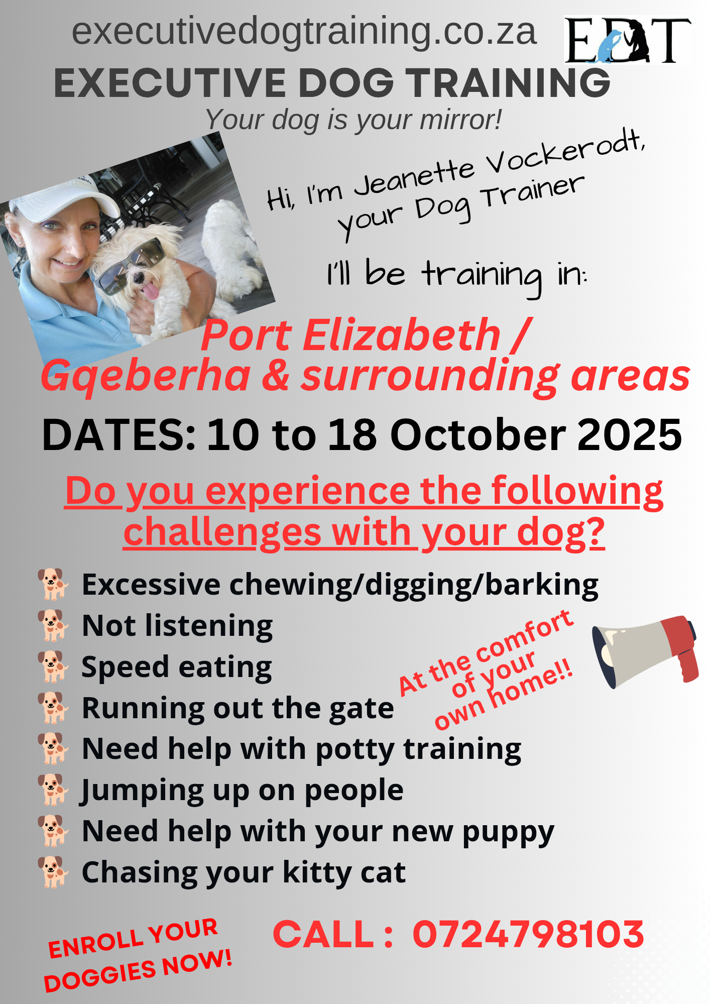 Welcome to Executive Dog Training in the Eastern Cape. We offer premium, in-home dog training services tailored to dog owners in Port Elizabeth / Gqeberha and surrounding areas, including Jeffreys Bay, and St Francis Bay.